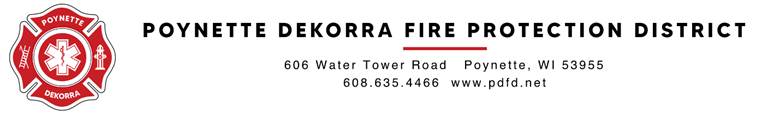 Contact: Cameron Radewan Fire Chief Poynette-Dekorra Fire District 606 Water Tower Rd, PO Box 364 Poynette, WI 53955 Phone: 608-635-4466 Email: info@pdfd.net